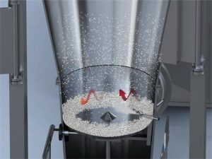 空氣經(jīng)加熱凈化后,由引風(fēng)機(jī)從下部導(dǎo)入,穿過料斗的孔網(wǎng)板。在工作室內(nèi),經(jīng)攪拌和負(fù)壓作用形成流態(tài)化,水份快速蒸發(fā)后隨著排氣帶走,物料快速干燥。